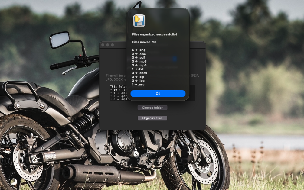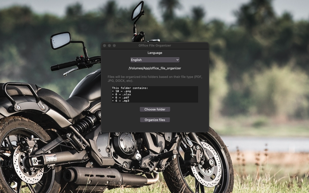 Just select a folder and the app automatically organizes files into subfolders based on file type (PDF, JPG, DOCX, MP3, ZIP, and more).